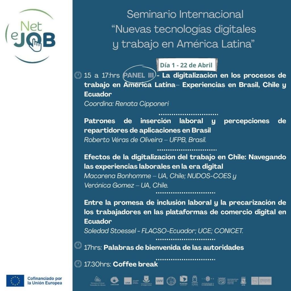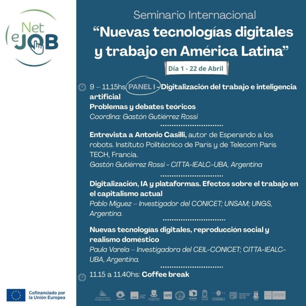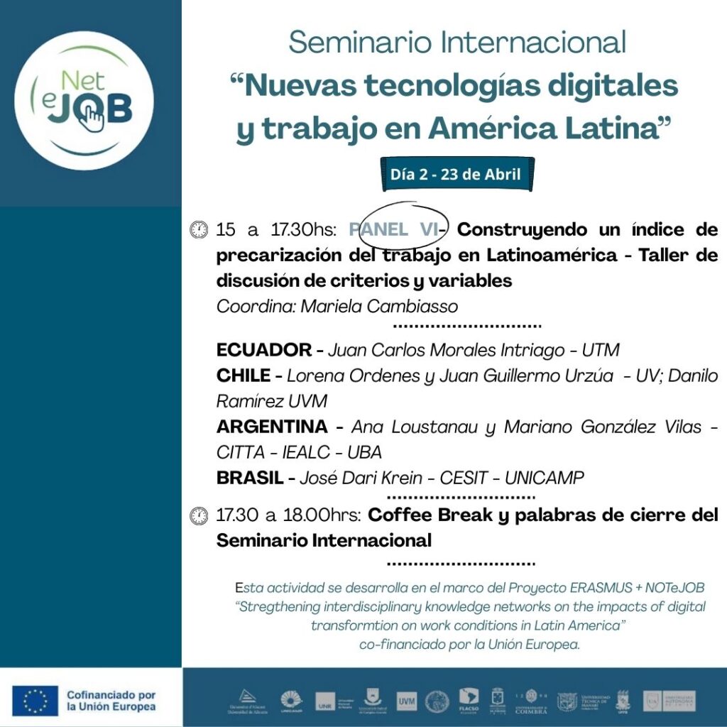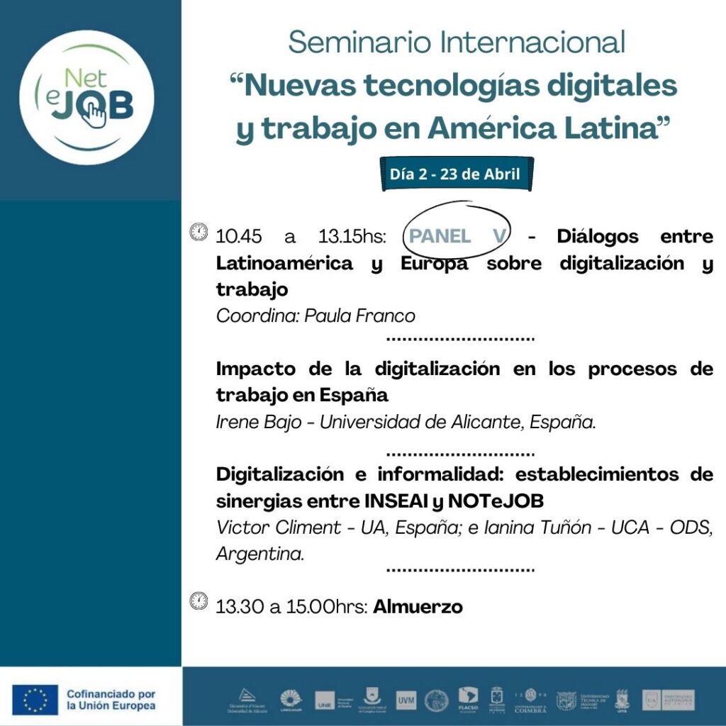 En el marco de las actividades del Proyecto NETeJOB “Fortalecimiento de redes interdisciplinarias de conocimiento sobre los impactos de la transformación digital en las condiciones de trabajo en América Latina”, el evento reunirá a socios y socias de NETeJOB, así como investigadores e investigadoras invitadas.