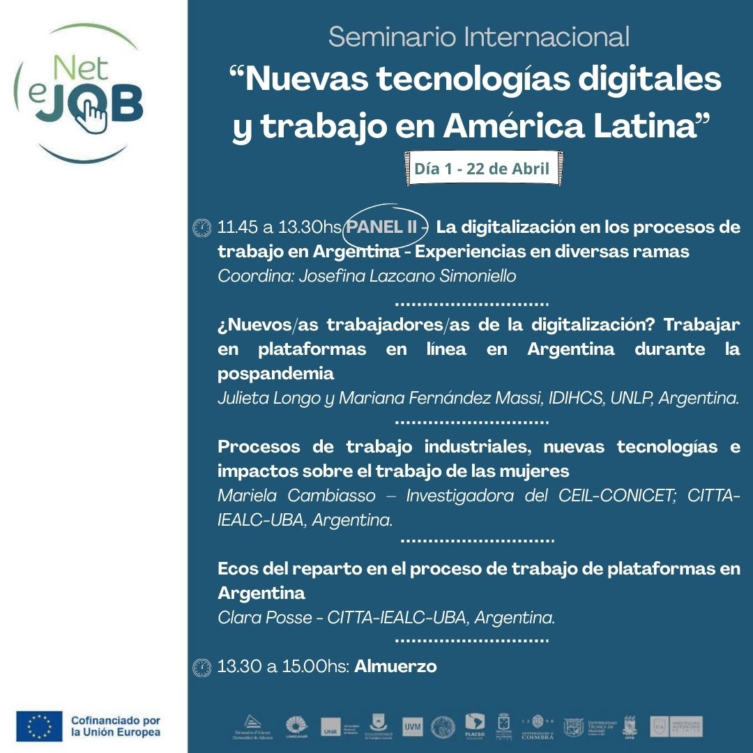 En el marco de las actividades del Proyecto NETeJOB “Fortalecimiento de redes interdisciplinarias de conocimiento sobre los impactos de la transformación digital en las condiciones de trabajo en América Latina”, el evento reunirá a socios y socias de NETeJOB, así como investigadores e investigadoras invitadas.