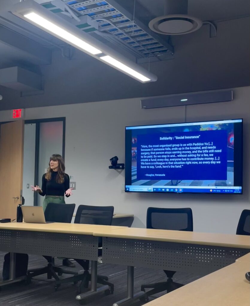 O pesquisador associado do Global Labor Research Center fez uma apresentação sobre trabalhadores migrantes da América Latina e do Caribe, examinando as experiências de trabalho e o racismo enfrentados pelos migrantes da América Latina e do Caribe enquanto trabalhavam em plataformas de entrega de alimentos no Chile.