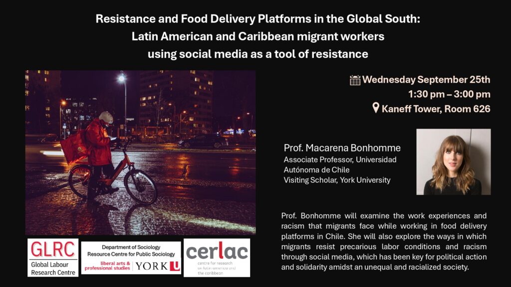 O evento foi co-patrocinado pelo Centro Global de Pesquisa sobre o Trabalho (GLRC), o Departamento de Sociologia, o Centro de Pesquisa sobre a América Latina e o Caribe (CERLAC) e o Centro de Recursos para Sociologia Pública (RCPS).